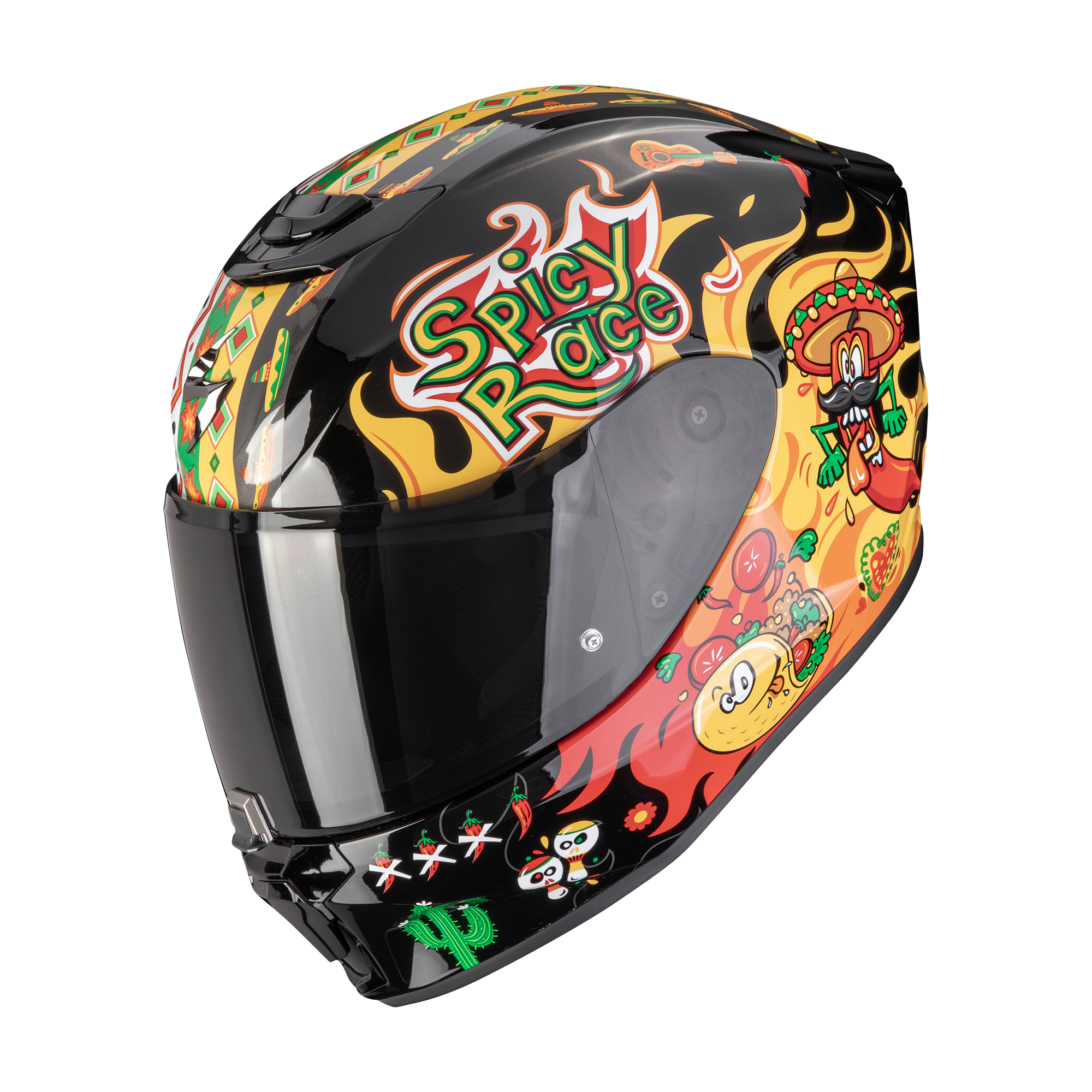 El Scorpion EXO JNR Yucatan Black Yellow Red  és un casc integral infantil dissenyat per oferir protecció i comoditat en l’ús diari. El seu disseny en negre amb detalls grocs i vermells presenta un grafisme atractiu i divertit, ideal per als més joves.