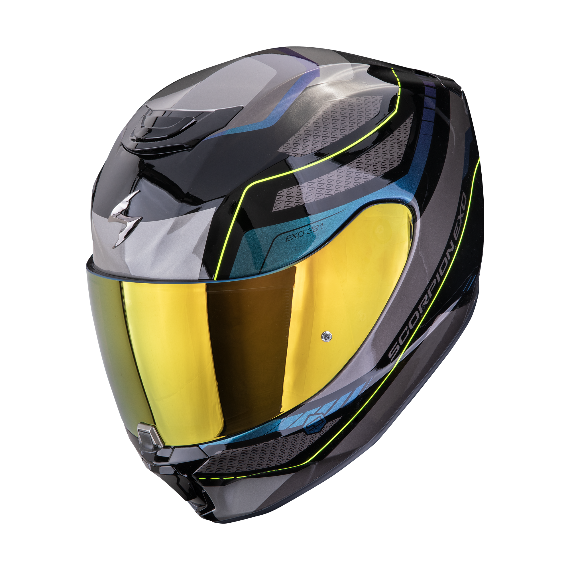 El Scorpion EXO 391 Leo Black Blue és un casc integral amb una estètica moderna i atrevida: el contrast entre el negre sobri de la calota i els detalls en blau li confereix un aire esportiu i elegant alhora, ideal per a motoristes que busquen un look distintiu sense sacrificar funcionalitat.