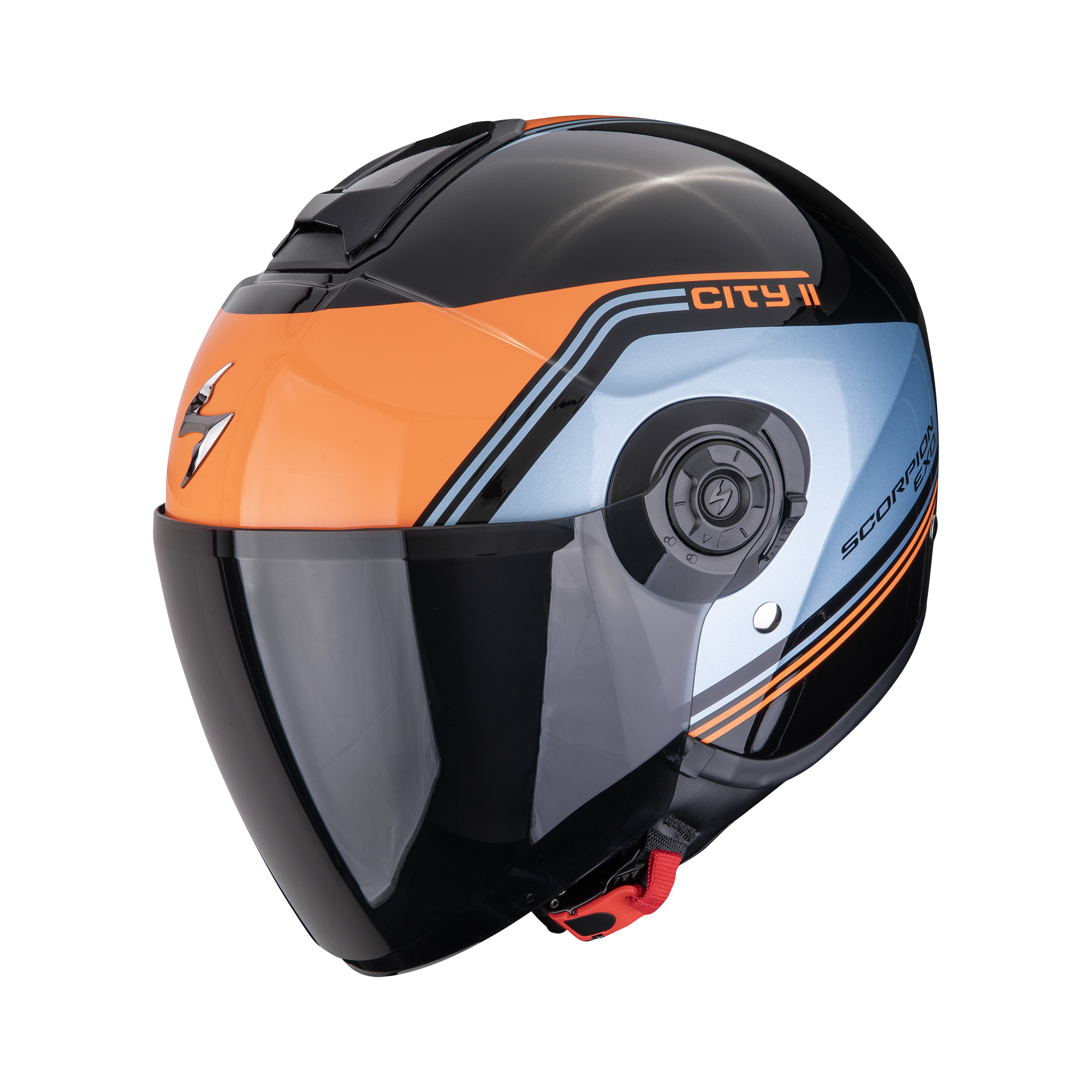 El Scorpion EXO City II VITA Black Blue Orange destaca con un diseño dinámico y moderno: la combinación de negro, azul y naranja le da un carácter urbano muy llamativo y con personalidad. Este casco es perfecto si quieres destacar sobre la carretera con estilo.