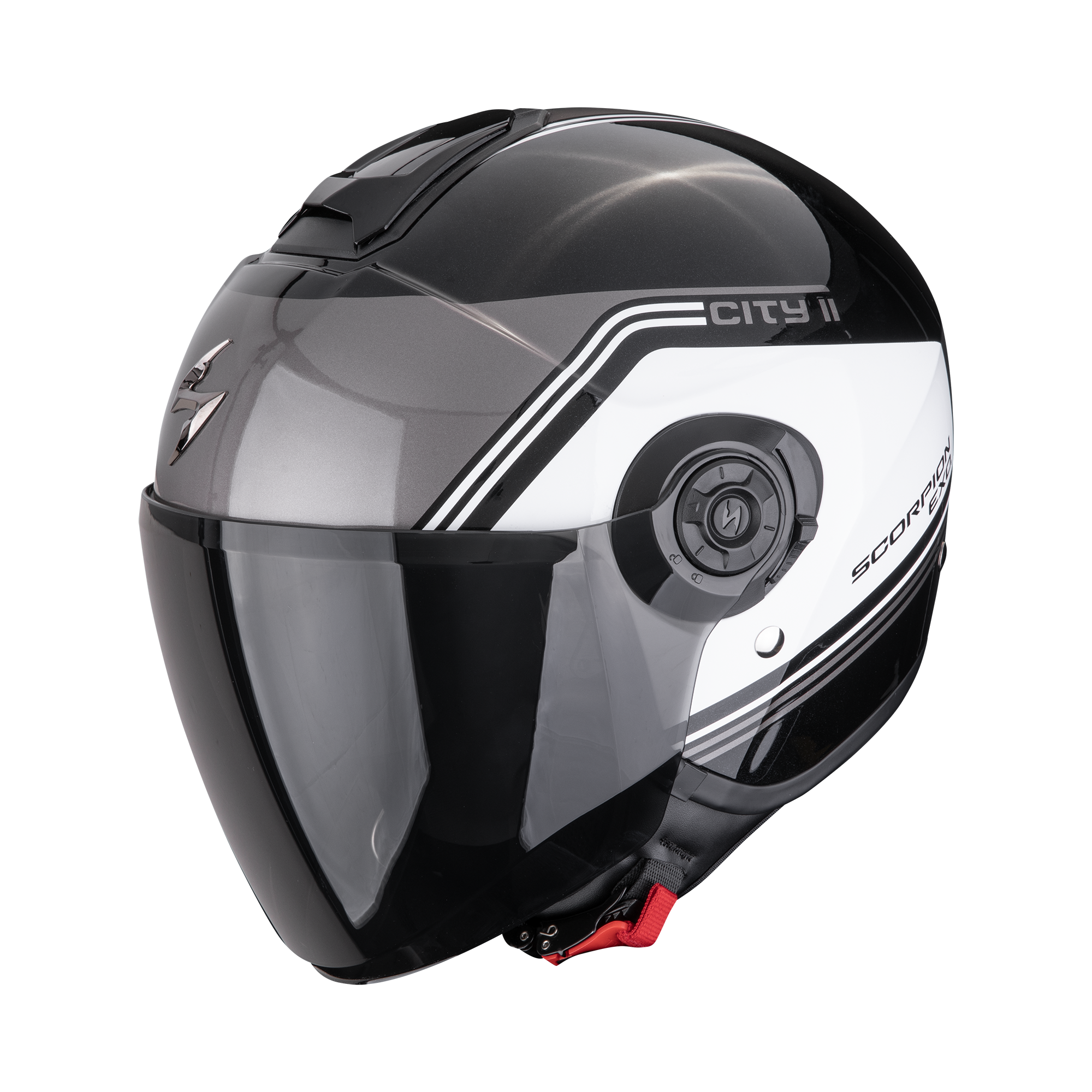 El Scorpion EXO City II VITA Metal Black White destaca por su diseño sobrio y elegante: la combinación de negro metálico y blanco le confiere un estilo moderno y urbano, ideal para quienes buscan un casco discreto pero con carácter.