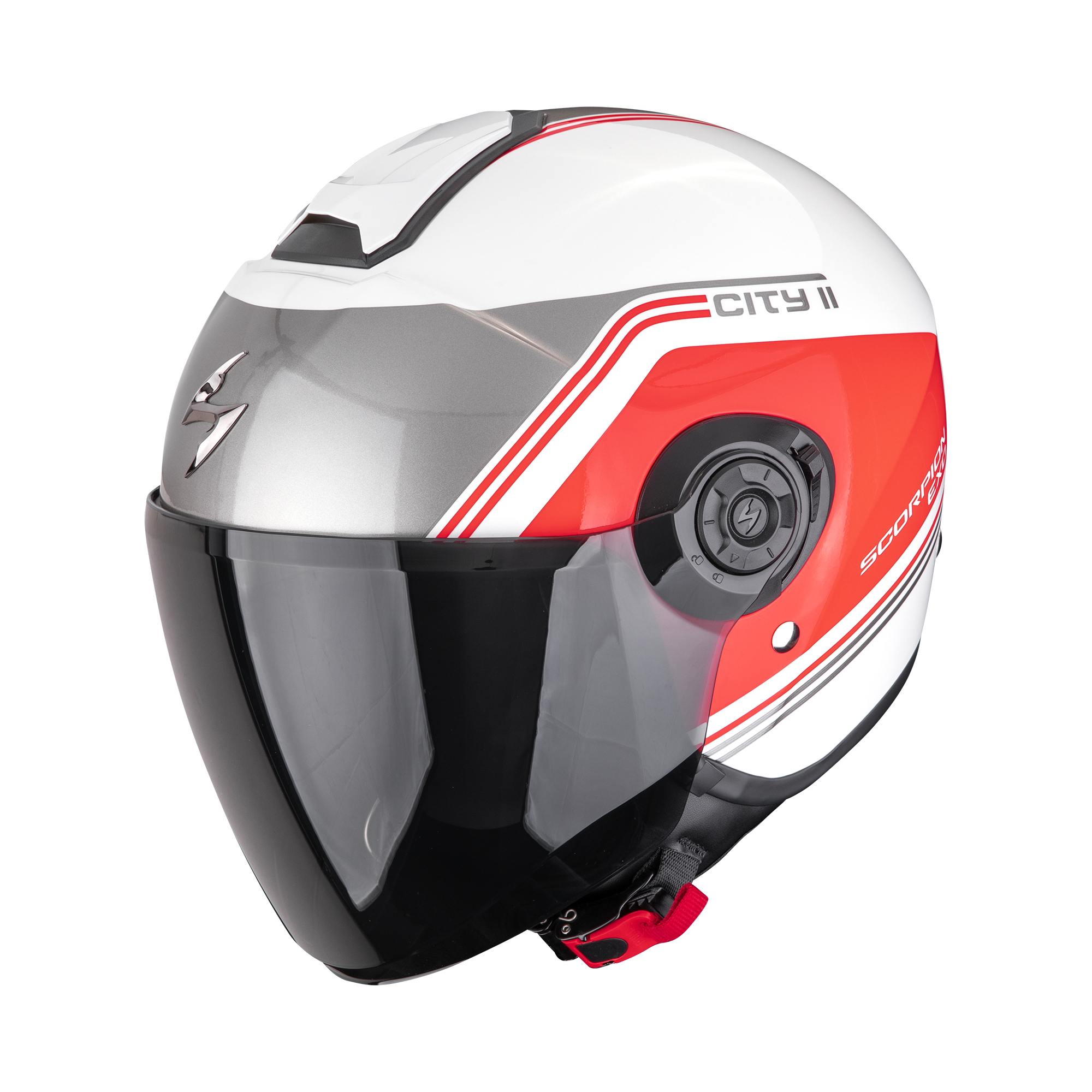 El Scorpion EXO City II VITA White Red destaca por su diseño impactante y con personalidad: la combinación de blanco y rojo le aporta un aire deportivo y urbano, ideal para quien quiere un casco llamativo sin sacrificar estilo.
