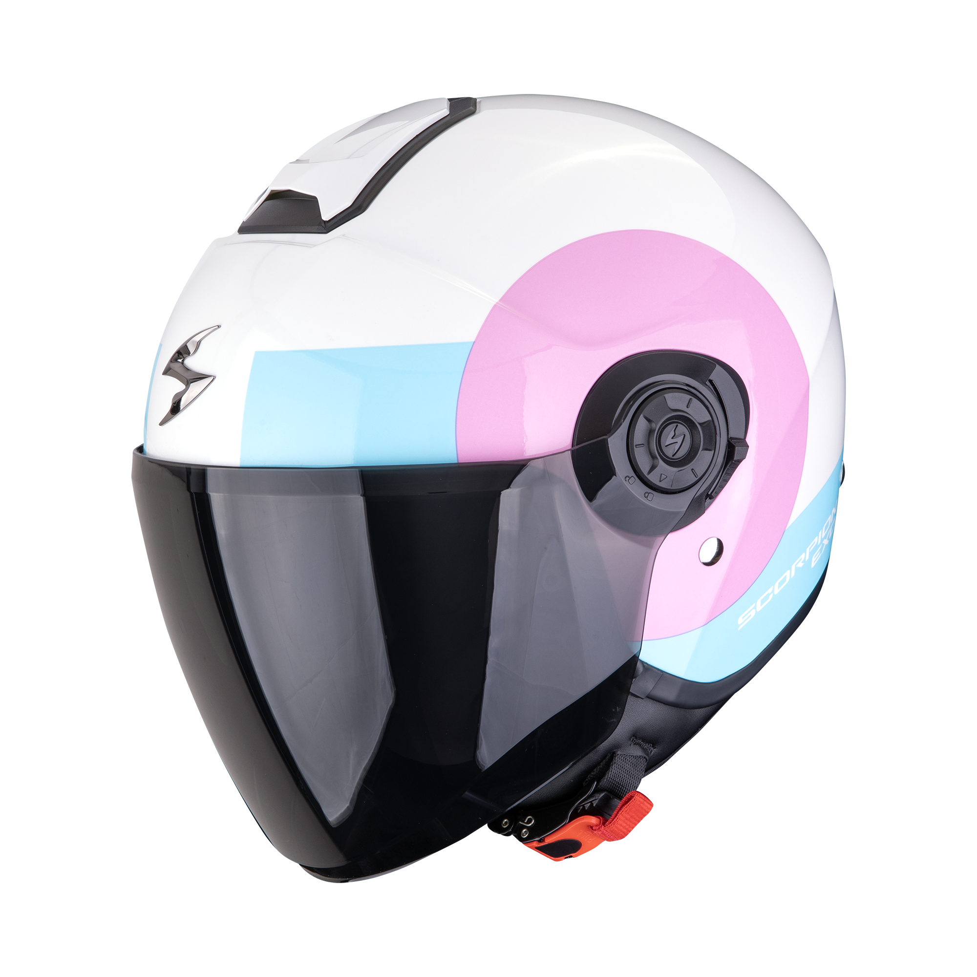 El Scorpion EXO City Sheer en tonos blanco, rosa y azul claro destaca por un estilo moderno, fresco y llamativo — ideal si buscas un casco con personalidad y un toque más atrevido.