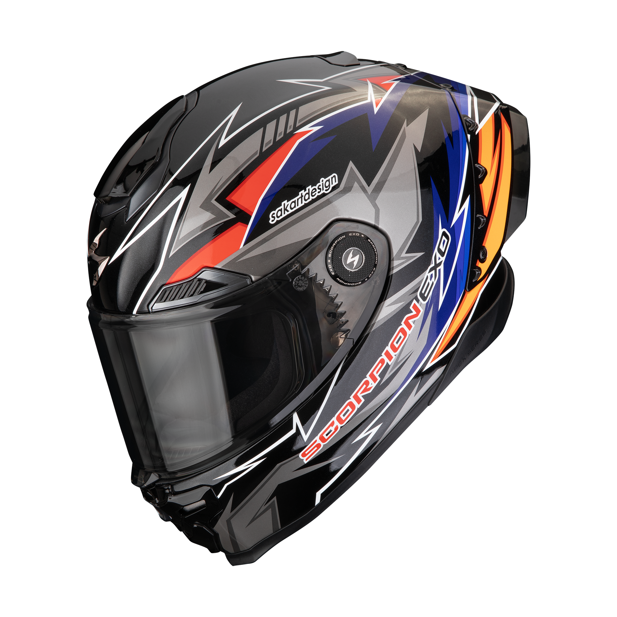 El Scorpion EXO-Race MoveOn Black Blue Orange “Get Stung” és un casc integral d’estil esportiu, pensat per a motoristes que busquen una imatge racing amb un disseny viu i dinàmic. La combinació de negre amb detalls blaus i taronges li dóna una presència molt marcada a la carretera.